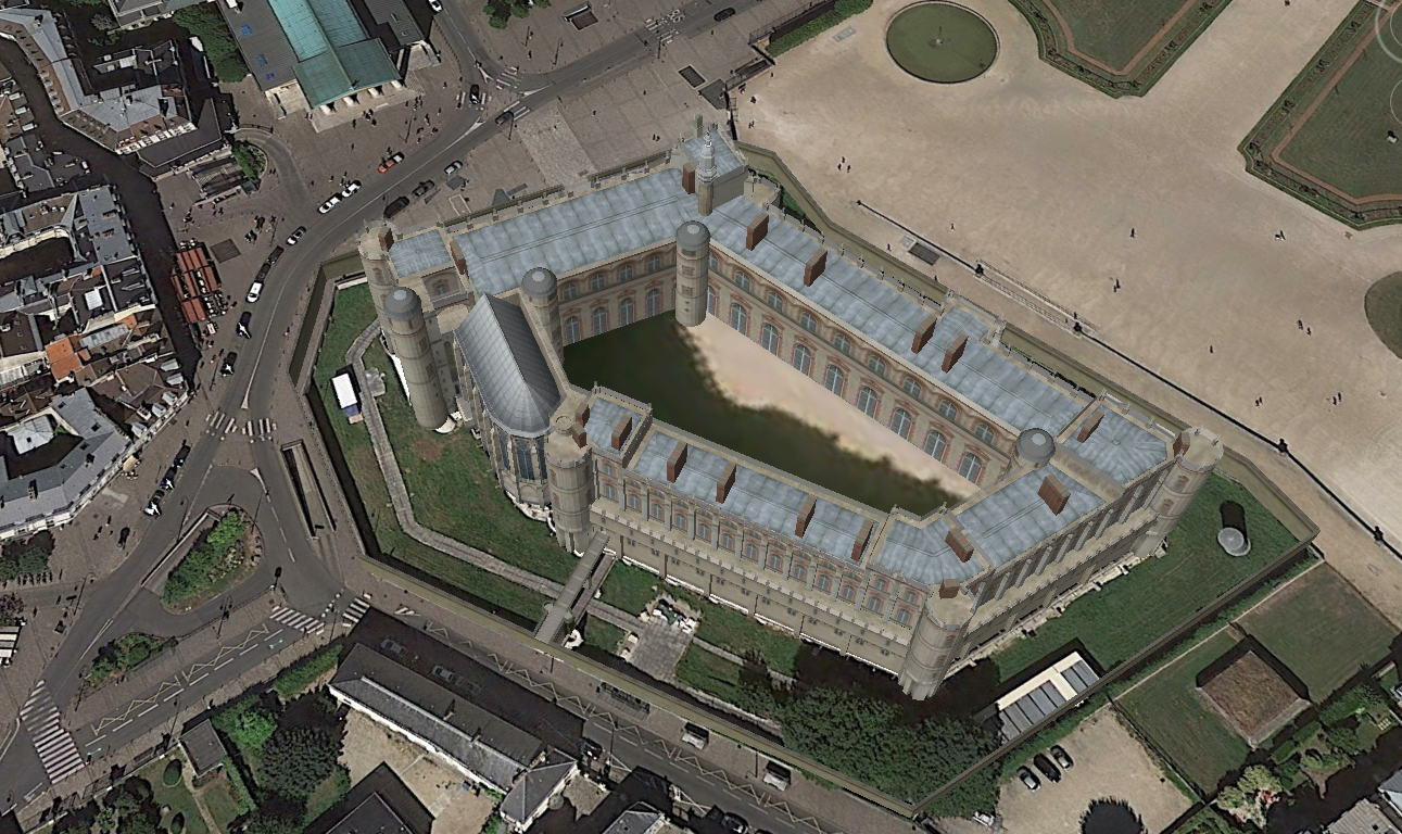 « Devant l'incendie, du règne du roy Philippe de Valois, l'an 1346, dit-il, il y avoit fait bâtir une tour très-forte, où il logeoit souvent, revenant de ses conquestes, Le château n'étoit bâty, clans ce temps, qu'en manière de forteresse, n'y ayant aucune cimétrie, avec quelques tours aux angles d'yceluy, entouré d'un large et profond fossé revestu de pierres de taille. Son rempart étoit très-fort, où il y avoit des créneaux meurtriers et abavents, ce qui lui servoit de deffences dans ce temps que la poudre n'étoit pas encore inventée.