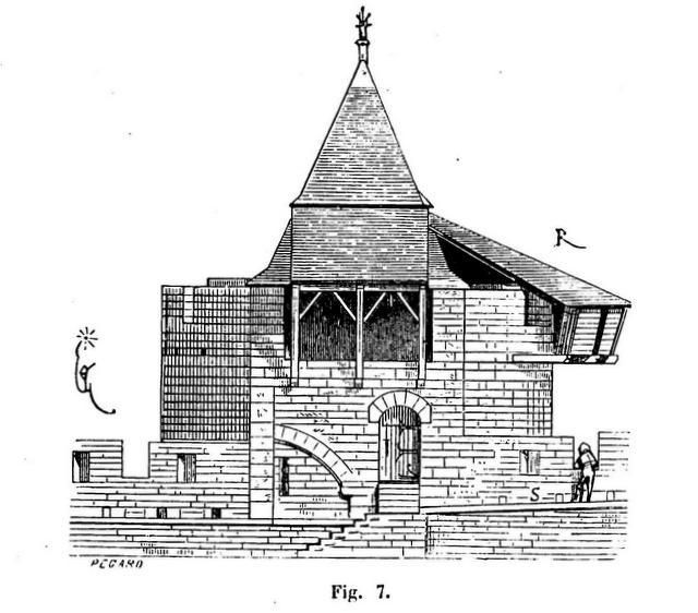 Or, cette surélévation est construite en pierres avec bossages, les créneaux sont plus espacés, l'appareil beaucoup plus soigné que dans la partie inférieure et parfaitement semblable, en tout, à l'appareil des constructions de 1280.